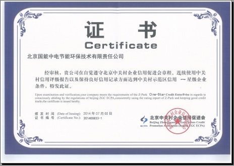 當(dāng)前位置: 國(guó)能中電公司動(dòng)態(tài)> 熱烈祝賀我公司榮獲“中關(guān)村示范區(qū)信用一星級(jí)企業(yè)證書”